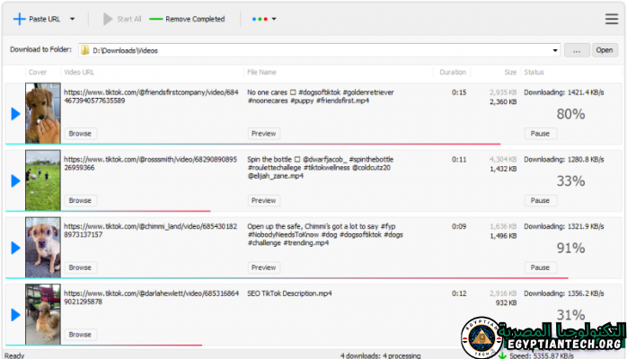 يتيح لك برنامج TikTok Downloader Full حفظ الروابط وتنزيل مقاطع فيديو متعددة في نفس الوقت، بالإضافة إلى كونه سريعًا جدًا في تنزيل مقاطع الفيديو، بالإضافة إلى إمكانية إيقاف التنزيلات مؤقتًا أو استئنافها أو إلغائها في أي وقت. طريقة تحميل الفيديوهات من البرنامج سهلة للغاية. كل ما عليك فعله هو نسخ رابط الفيديو الذي تريده. قم بتنزيله ووضعه في البرنامج، واختر مكان حفظ الفيديو واضغط على زر بدء التنزيل.