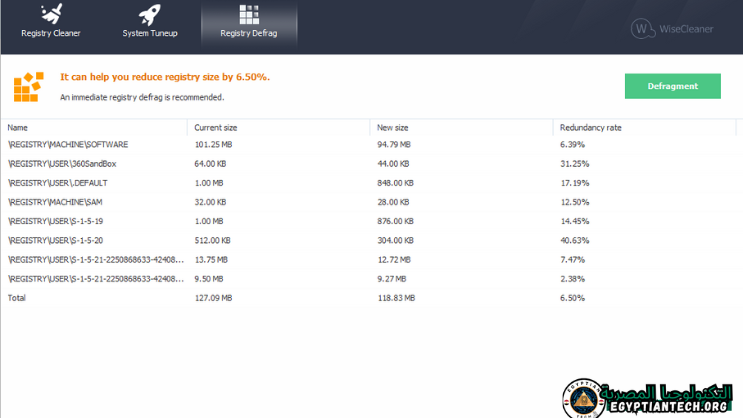 يقوم Wise Registry Cleaner Pro أيضًا بإلغاء تجزئة السجل مما يسمح بإعادة ترتيب البيانات الموجودة داخل سجل Windows وتنظيمها بطريقة منسقة ومنظم مما يجعل العثور عليها عند الطلب أسرع وأفضل مما يقلل العبء على النظام ويقلل من تباطؤ Windows والتجميد أثناء فتح البرامج والملفات بمختلف أنواعها، لأن عملية إلغاء تجزئة السجل تجعل سجل النظام يستجيب للأوامر بشكل أفضل وأسرع بكثير من ذي قبل.